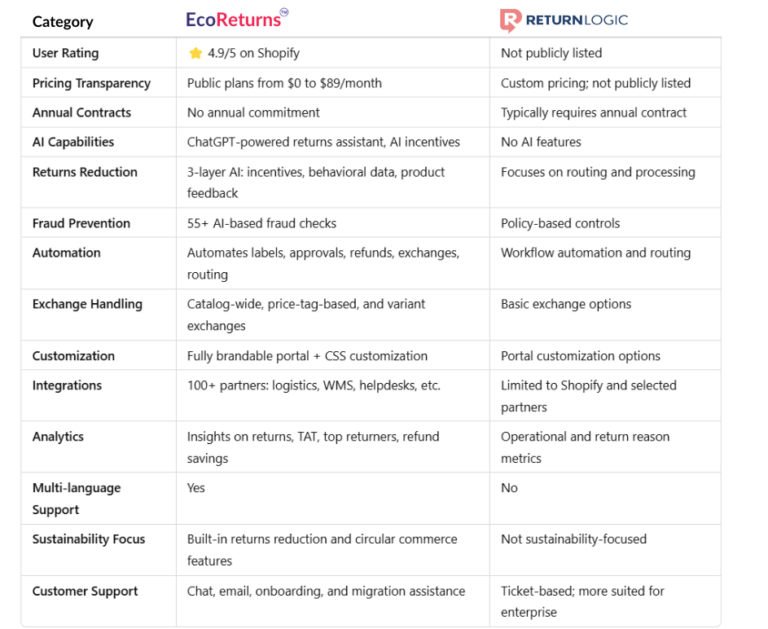 EcoReturns brings advanced AI to returns through various AI tools, ChatGPT-powered support, automated workflows, and incentive optimization to reduce returns. ReturnLogic offers robust automation but lacks AI personalization and returns reduction capabilities.